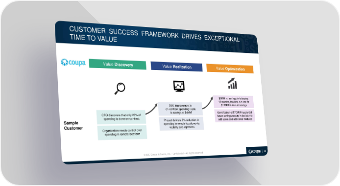 CUSTOMER SUCCESS FRAMEWORK DRIVES EXCEPTIONAL TIME TO VALUE Value Discovery Value Realization Value Optimization $6MM of savings in following 12 months, leads to run rate of 93% improvement in $10MM in annual savings on-contract spending leads CFO discovers that only 26% of to savings of $4MM Identification of $70MM in potential spending is done on-contract future savings results in decision to Sample Project delivers 8% reduction in add users and additional modules Customer spending in remote locations via Organization needs control over visibility and rejections spending in remote locations ©2017 Coupa Software, Inc. – Confidential – All Rights Reserved 22