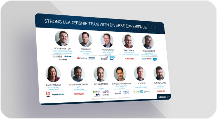 STRONG LEADERSHIP TEAM WITH DIVERSE EXPERIENCE ROB BERNSHTEYN TODD FORD STEVE WINTER RAVI THAKUR ROGER GOULART CHIEF EXECUTIVE OFFICER, CHIEF FINANCIAL CHIEF REVENUE SVP, CUSTOMER SVP, BUSINESS CHAIRMAN OF THE BOARD OFFICER OFFICER SUCCESS AND SERVICE DELIVERY DEVELOPMENT & ALLIANCES RAJA HAMMOUD JP KRISHNAMOORTHY RAY MARTINELLI CHANDAR PATTABHIRAM JON STUEVE DAVID WILLIAMS SVP, PRODUCT SVP, EVP, CHIEF MARKETING VP & VP, MANAGEMENT ENGINEERING PEOPLE OFFICER GENERAL COUNSEL TECHNOLOGY ©2017 Coupa Software, Inc. – Confidential – All Rights Reserved 27