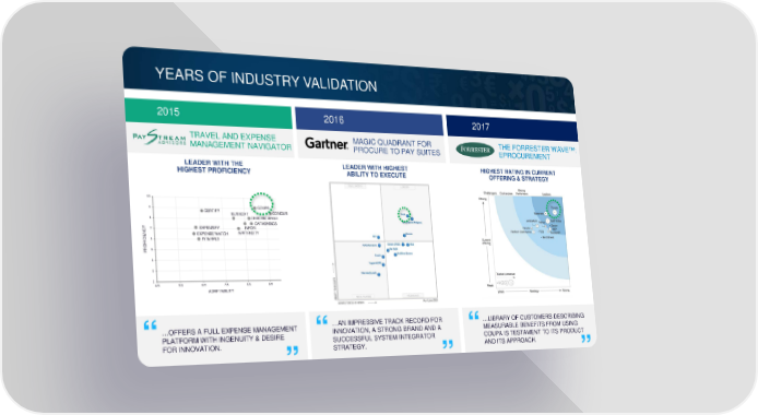 YEARS OF INDUSTRY VALIDATION 2015 2016 2017 TRAVEL AND EXPENSE MAGIC QUADRANT FOR THE FORRESTER WAVE™: MANAGEMENT NAVIGATOR PROCURE TO PAY SUITES EPROCUREMENT LEADER WITH THE LEADER WITH HIGHEST HIGHEST RATING IN CURRENT HIGHEST PROFICIENCY ABILITY TO EXECUTE OFFERING & STRATEGY 10 9 CERTIFY COUPA SUTISOFT CONCUR 8 CHROME RIVER DATABASICS 7 EXPENSIFY INFOR NCY EXPENSE WATCH APPTRICITY E CI6 INTERPLX I F RO5 P 4 3 2 4.5 5.5 6.5 7.5 8.5 9.5 ADAPTABILITY …AN IMPRESSIVE TRACK RECORD FOR …LIBRARY OF CUSTOMERS DESCRIBING “ “ “ …OFFERS A FULL EXPENSE MANAGEMENT INNOVATION, A STRONG BRAND AND A MEASURABLE BENEFITS FROM USING PLATFORM WITH INGENUITY & DESIRE “ “ “ 20 FOR INNOVATION. SUCCESSFUL SYSTEM INTEGRATOR COUPA IS TESTAMENT TO ITS PRODUCT ©2017 Coupa Software, Inc. – Confidential – All Rights Reserved 20 STRATEGY. AND ITS APPROACH.