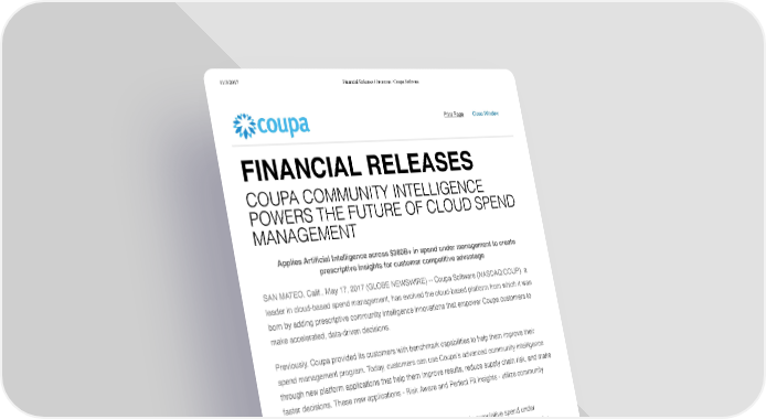 11/3/2017 Financial Releases | Investors | Coupa Software Print Page Close Window FINANCIAL RELEASES COUPA COMMUNITY INTELLIGENCE POWERS THE FUTURE OF CLOUD SPEND MANAGEMENT Applies Artificial Intelligence across $360B+ in spend under management to create prescriptive insights for customer competitive advantage SAN MATEO, Calif., May 17, 2017 (GLOBE NEWSWIRE) -- Coupa Software (NASDAQ:COUP), a leader in cloud-based spend management, has evolved the cloud-based platform from which it was born by adding prescriptive community intelligence innovations that empower Coupa customers to make accelerated, data-driven decisions. Previously, Coupa provided its customers with benchmark capabilities to help them improve their spend management program. Today, customers can use Coupa’s advanced community intelligence through new platform applications that help them improve results, reduce supply chain risk, and make faster decisions. These new applications - Risk Aware and Perfect Fit Insights - utilize community intelligence. Coupa’s community intelligence takes advantage of $360 billion in cumulative spend under management to create prescriptive insights for customers. This innovation is powered in part by acquisitions the company has made - Spend360 for artificial intelligence based spend classification and Riskopy for data aggregation. “With Coupa community intelligence, we are leveraging the supremacy of a true cloud platform and the power of our customer community to help individual customers optimize the way they spend,” said Rob Bernshteyn, CEO, Coupa. “Our innovations in this space can significantly improve decisions, accelerate the pace of business, and reduce risk in ways never before possible in our industry.” http://investors.coupa.com/phoenix.zhtml?c=254436&p=irol-newsArticle_print&ID=2273670 1/3