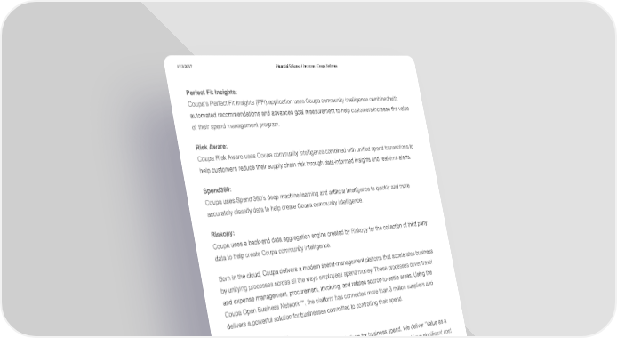 11/3/2017 Financial Releases | Investors | Coupa Software Perfect Fit Insights: Coupa’s Perfect Fit Insights (PFI) application uses Coupa community intelligence combined with automated recommendations and advanced goal measurement to help customers increase the value of their spend management program. Risk Aware: Coupa Risk Aware uses Coupa community intelligence combined with unified spend transactions to help customers reduce their supply chain risk through data-informed insights and real-time alerts. Spend360: Coupa uses Spend 360’s deep machine learning and artificial intelligence to quickly and more accurately classify data to help create Coupa community intelligence. Riskopy: Coupa uses a back-end data aggregation engine created by Riskopy for the collection of third party data to help create Coupa community intelligence. Born in the cloud, Coupa delivers a modern spend-management platform that accelerates business by unifying processes across all the ways employees spend money. These processes cover travel and expense management, procurement, invoicing, and related source-to-settle areas. Using the Coupa Open Business Network™, the platform has connected more than 3 million suppliers and delivers a powerful solution for businesses committed to controlling their spend. About Coupa Software Coupa Software (NASDAQ:COUP) is the cloud platform for business spend. We deliver “Value as a Service” by helping our customers maximize their spend under management, achieve significant cost savings and drive profitability. Coupa provides a unified, cloud-based spend management platform that connects hundreds of organizations representing the Americas, EMEA, and APAC with millions of suppliers globally. The Coupa platform provides greater visibility into and control over how companies spend money. Customers – small, medium and large – have used the Coupa platform to bring billions of dollars in cumulative spend under management. Learn more at www.coupa.com. Read more on the Coupa Blog or follow @Coupa on Twitter. Media inquiries: Orlando De Bruce http://investors.coupa.com/phoenix.zhtml?c=254436&p=irol-newsArticle_print&ID=2273670 2/3